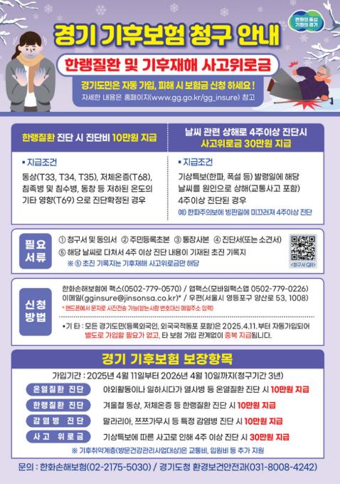 경기 기후보험은 폭염뿐 아니라 한파·폭설 등 겨울철 기후위험으로 발생한 한랭질환과 기후재해 사고에 대해 진단비와 위로금을 지원하는 제도로, 겨울철 일상 속 사고와 건강 피해까지 포괄적으로 보장한다.