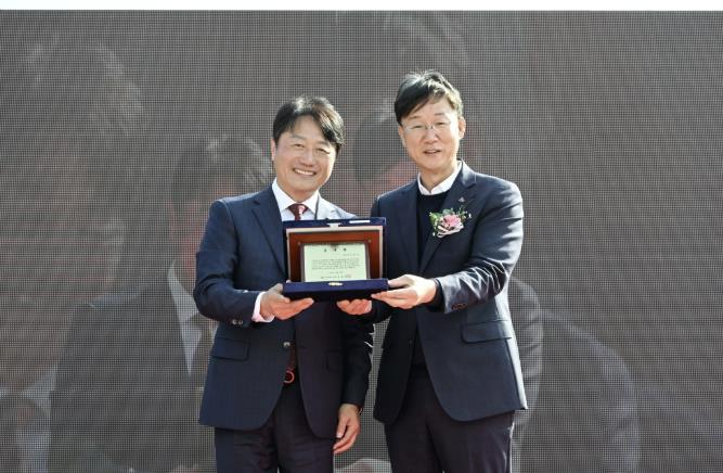 | ▲ 이민근 안산시장(오른쪽)이 윤동열 안산대학교 총장(왼쪽)으로부터 감사패를 전달받고 함께 기념촬영을 하고 있다. |