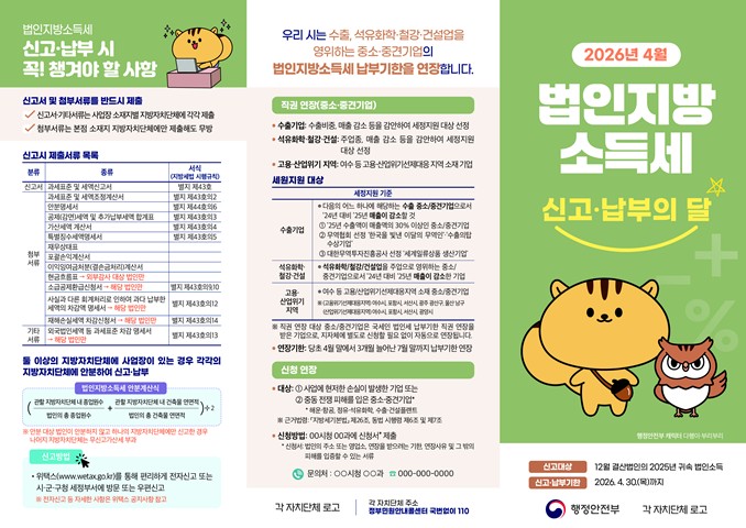 특히, 중동 전쟁으로 피해를 입은 해운·항공·수출·건설 플랜트 분야 및 재해 손실 등으로 사업의 현저한 손실이 발생한 기업이 기한연장을 신청하는 경우 법인지방소득세 신고납부기한을 6개월 연장한다.