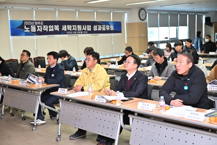 [코리아 이슈저널=홍춘표 기자] 완주군의회 김재천 부의장과 심부건 의원이 지난 22일 봉동읍행정복지센터에서 열린 ‘2025년 완주고용지원단 성과공유회’에 참석해 관내 기업의 고용 현안을 점검하고 노동환경 개선 정책의 추진 성과를 공유했다.