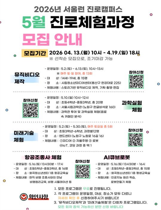 시립청소년미디어센터에서는 5월 2일~6월 13일 총 13회 과정으로 중‧고등학생 15명 대상 뮤직비디오 기획부터 촬영, 편집까지 콘텐츠 제작 전 과정을 통해 기획력과 창의적 표현 역량을 키워주는 프로그램이 운영된다. 시립노원청소년미래진로센터(앤드센터)에서는 5월 2일부터 매주 토요일 총 5회 초등 3~6학년 48명(12명×4개 과정) 대상 자율주행, 로봇, IoT코딩, 미디어 중 하나를 선택해 체험하는 과정이 운영된다. 화곡청소년센터는 5월 16일 초등 5학년~중등 3학년 31명 대상 현직 조종사와 함께 비행 원리를 배우고 시뮬레이션으로 조종을 체험하거나 AI 큐브로봇 제작 과정에 참여하는 항공조종사 체험을 운영하며, 시립과학관은 5월 10일 초‧중학생 대상 과학관 전시 해설, 음료 속 카페인 분석 등 생활 속 과학 원리를 실험으로 확인하는 프로그램을 제공한다.