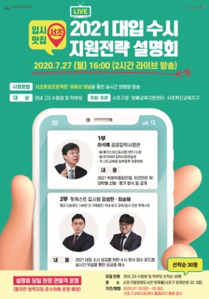 서울 서초구(구청장 조은희)는 27일 오후 4시 대입 수시 원서 접수를 앞둔 고3 수험생과 학부모를 대상으로 '2021 대입 수시 지원전략 설명회'를 연다.
