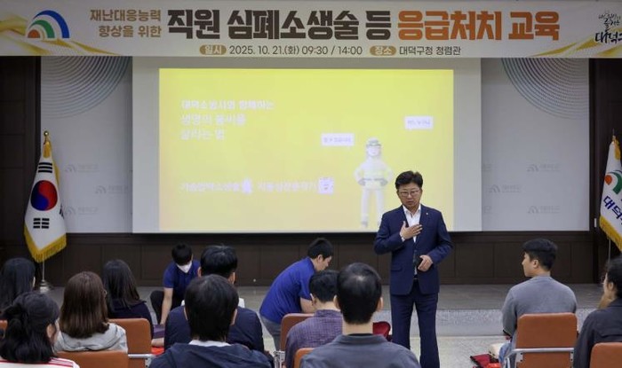 [코리아 이슈저널=홍종수 기자] 대전 대덕구는 21일 구청 청렴관에서 공직자의 응급 상황 대응 역량 강화를 위한 심폐소생술(CPR) 및 응급처치 교육을 실시했다고 밝혔다.