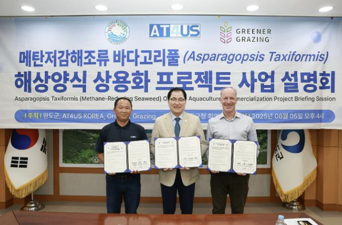 [코리아 이슈저널=김종오 기자] 완도군은 지난 6월 5일 해양 블루테크 스타트업 AT4US Korea와 글로벌 바다고리풀 연구 기업 Greener Grazing LLC와 토종 바다고리풀(Asparagopsis taxiformis)을 활용한 양식 산업 발전과 축산 메탄 저감 탄소 중립 실현을 위한 3자 간 업무 협약을 체결했다.