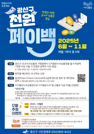 광산구 내 온누리상품권 가맹점에서 디지털 온누리상품권을 사용하면 누적 사용 금액의 10%를 환급해 주는 사업이다.