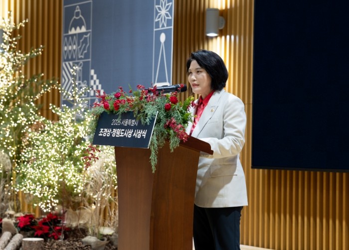 [코리아 이슈저널=최성일 기자] 서울특별시의회 박춘선 환경수자원위원회 부위원장(강동3, 국민의힘)은 12월 10일 서울시청 본관 8층 다목적홀에서 열린 ‘2025 서울특별시 조경상·정원도시상 시상식’에 참석해 축사를 전하며, 서울의 도시녹화와 정원문화 확산에 기여한 수상자들을 축하했다.