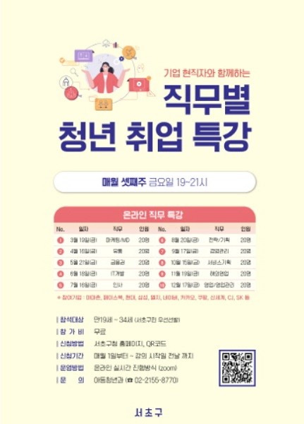 [열린의정뉴스 = 최성일 기자] 서울 서초구(구청장 조은희)는 코로나19 장기화로 인해 취업 문이 좁아져 어려움을 겪고 있는 청년 구직자를 돕고자 '기업 현직자와 함께하는 직무별 청년 취업특강'을 연중 운영한다고 밝혔다.