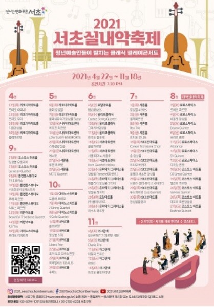 [열린의정뉴스 = 최성일 기자] 서울 서초구(구청장 조은희)는 오는 22일부터 12월까지 클래식 분야의 재능과 실력이 있는 청년예술인 70팀이 참여하는 릴레이 콘서트 '2021 서초실내악축제'를 운영한다.
