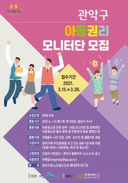 [열린의정뉴스 = 이창희 기자] 서울 관악구(구청장 박준희)가 15일부터 오는 26일까지 '2021년 관악구 아동 권리 모니터단' 50명을 모집한다고 밝혔다.