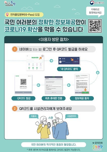 전자출입명부시스템은 이용자가 발급받은 QR코드를 시설출입 시 관리자의 전용앱으로 인식하면 이용자 방문기록이 DB화 되어 분산 보관하였다가 필요시 질병관리본부에서 열람하는 방식이다.