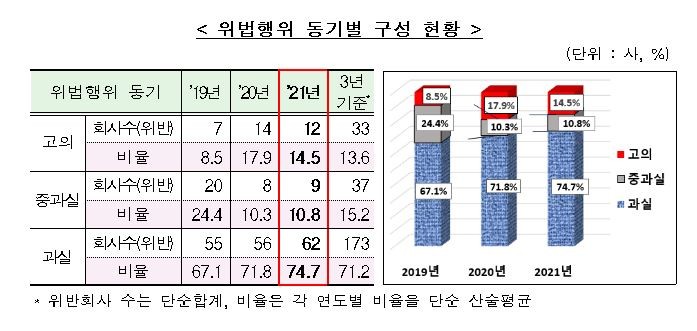 반면 전체 위반 가운데 '과실'이 사유로 결정된 비율은 증가세다. 작년 '과실' 결정 비율은 74.7%로, 2019년 67.1%, 2020년 71.8%에 이어 매년 증가하고 있다.