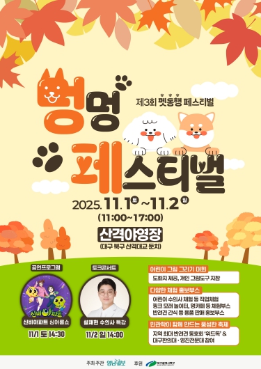 [코리아 이슈저널=김태훈 기자] 올해로 3회째를 맞이하는 지역 최대 야외 반려동물 행사인 『2025 멍멍 페스티벌(제3회 펫 동행 페스티벌)』이 11월 1일부터 11월 2일까지 산격야영장(산격대교 하단 둔치 일원)에서 개최된다.