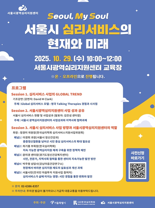 서울시광역심리지원센터 교육장에서 열리는 이번 심포지엄은 ‘Seoul, My Soul: 서울시 심리서비스의 현재와 미래’를 주제로 한다. 심포지엄엔 서울시민, 서울시 관계자, 관련 학회, 유관기관 및 전문가 등 약 150명이 온·오프라인으로 참석해 공공 심리서비스 방향을 다각도로 논의할 예정이다.