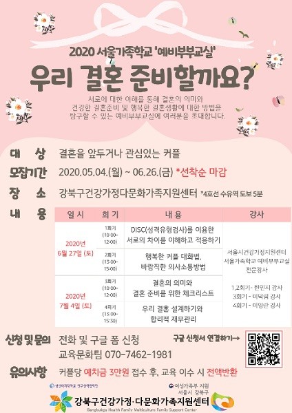 [열린의정뉴스 = 김진성 기자] 강북구(구청장 박겸수)는 강북구건강가정·다문화가족지원센터(센터장 한은주) 주관으로 예비부부교실 ‘우리 결혼 준비할까요?’ 프로그램을 진행한다.