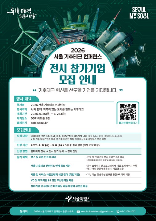 [코리아 이슈저널=최준석 기자] 서울시는 4월 17일부터 5월 6일까지 ‘2026 기후테크 컨퍼런스’ 참여할 혁신 기업을 모집한다. “AI와 함께, 회복력 있는 도시를 만드는 기후테크”를 주제로 열리는 이번 행사는 환경의 달을 맞아 6월 25일~26일 이틀간 DDP 아트홀 2관에서 개최된다.