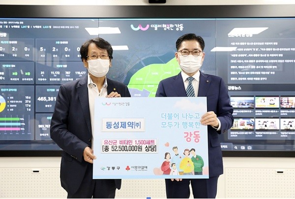 [열린의정뉴스 = 최성일 기자]강동구(구청장 이정훈)는 지난 10일 동성제약(주)과 유산균 1500세트(총 52,500천 원 상당)에 대한 전달식을 가졌다. 후원품은 저소득층 통합사례관리대상 아동과 강동푸드뱅크마켓을 통해 저소득 주민에게 전달된다.