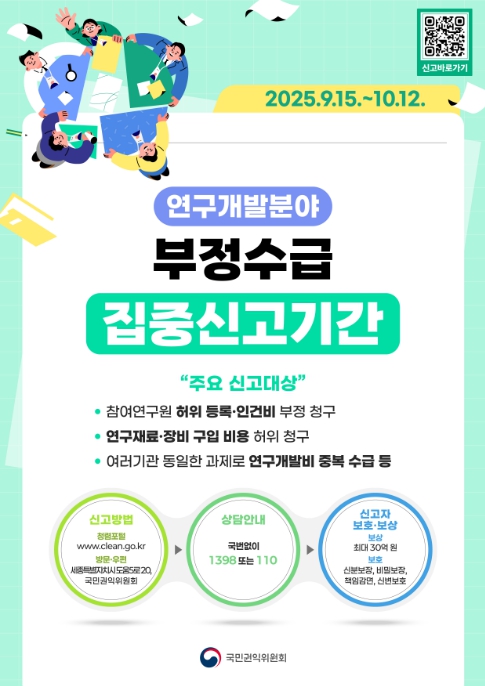 [코리아 이슈저널=최용달 기자] 국민권익위원회는 15일부터 10월 12일까지 연구개발 분야 정부지원금 부정수급 집중신고기간을 운영한다고 밝혔다.
