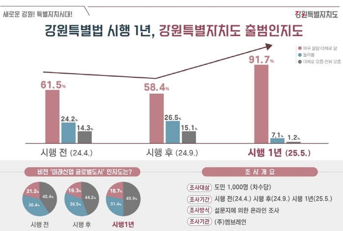 조사 결과, 강원특별자치도 출범에 대한 도민 인지도는 시행 전에는 매우 잘 알고 있거나 대체로 알고 있다고 응답한 비율이 61.5%였으나 시행 1년 후 91.7%로 크게 상승한 것으로 나타났다.