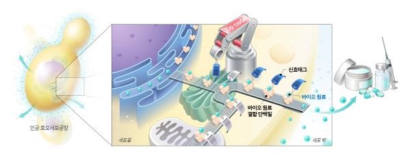 | ▲ 연구 결과 모식도 바이오 원료를 생산하는 인공 세포공장(좌·효모) 속의 특정 바이오 원료를 세포 밖으로 배송할 수 있는 시스템. [한국화학연구원 제공. 재판매 및 DB 금지] |