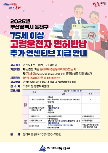 [코리아 이슈저널=김태훈 기자] 부산 동래구는 고령 운전자 교통사고를 예방하고 안전한 교통 환경을 조성하기 위해 2026년부터 ‘고령 운전자 운전면허 자진 반납 추가 인센티브 지급 사업’을 추진한다고 밝혔다.