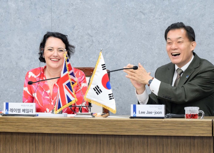 | ▲ 이재준 수원특례시장(오른쪽)과 베넨든스쿨 레이첼 베일리(Rachel Bailey) 교장이 협약식에서 대화를 나누며 웃고 있다. |