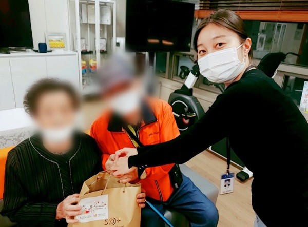 | ▲ 지난 4일 용산구 치매안심센터 직원이 센터를 찾은 어르신들에게 밑반찬을 전달했다[출처=용산구청] |