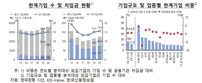 한은은 보고서에서 "2018년 이후 한계기업 비중이 증가세를 보이는데다 대기업의 한계기업 진입이 증가하고 기업당 평균 차입금(1천509억원)이 중소기업(164억원)의 약 10배에 이르는 만큼 한계기업 차입금의 부실에 따른 금융기관 자산건전성 저하 가능성에 유의할 필요가 있다"고 밝혔다.