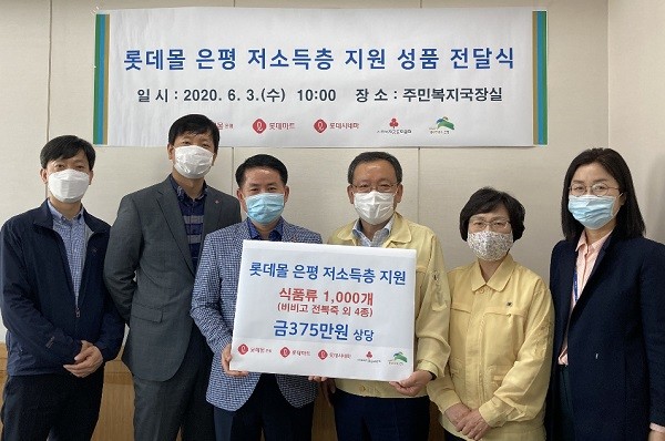 [열린의정뉴스 = 김진성 기자] 은평구(구청장 김미경)는 지난 3일 주민복지국장실에서 롯데몰 은평(운영협의체장 장호근)과 저소득 가구 지원을 위한 성품 전달식을 가졌다고 밝혔다.