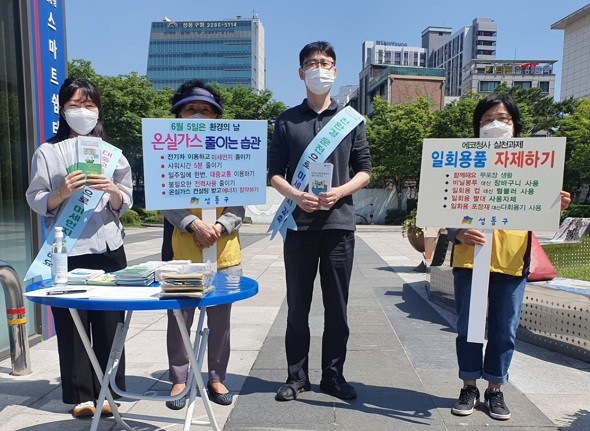 또한 왕십리역 광장에서 탄소중립 생활 실천을 위한 일회용품 사용 줄이기, 온실가스 줄이는 방법 등을 전파하는 캠페인을 실시, ‘성동구주부환경연합회’ 회원들과 함께 친환경 전기차 이용과 에코마일리지나 승용차마일리지와 같은 환경마일리지 가입을 안내하고 가정의 온실가스 진단·컨설팅 사업을 홍보하여 구민들에게 환경에 대한 관심을 높였다.