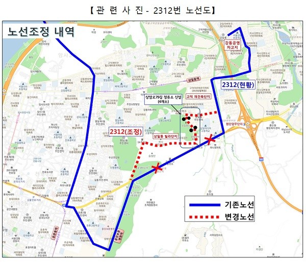 [열린의정뉴스 = 김진성 기자] 강동구(구청장 이정훈)가 고덕재건축단지 및 상일지역 주민의 지하철 9호선 중앙보훈병원역 환승 여건 개선을 위해 시내버스 2312번의 노선 조정을 완료하고 오는 30일 첫차부터 변경된 노선으로 운행된다고 밝혔다.
