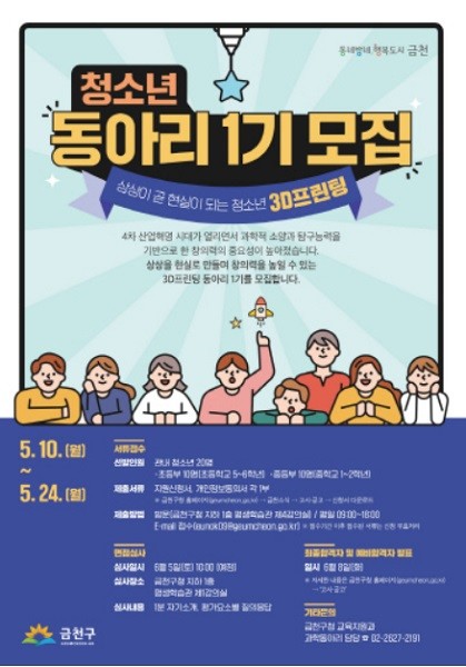 [열린의정뉴스 = 김진성 기자] 금천구(구청장 유성훈)는 미래 창의 과학 인재 양성을 위한 '청소년 3D프린팅 동아리'를 운영, 참여자 20명을 오는 24일(월)까지 모집한다고 밝혔다.