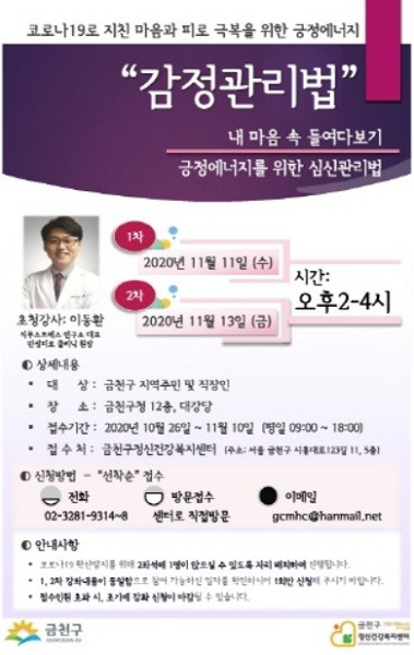 구는 오는 11일과 13일 오후 2시부터 4시까지 금천구민과 구 직원을 대상으로 '감정관리법' 강좌를 개최한다고 밝혔다.