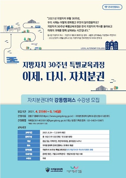 [열린의정뉴스 = 최성일 기자] 강동구(구청장 이정훈)는 지방자치 30주년 특별교육과정으로 ‘한국 지방자치 역사와 미래의 과제’라는 주제로 「2021년 자치분권대학 강동캠퍼스」를 개설하여 5월 14일까지 수강생을 모집한다.