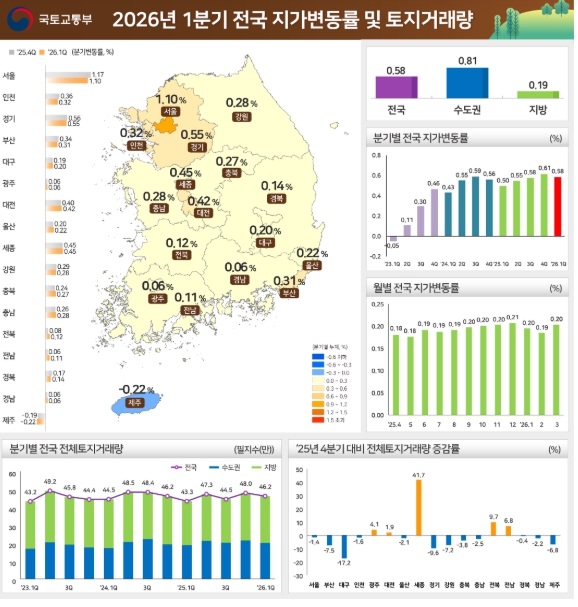 국토교통부, '26년 1분기 전국 지가 0.58% 상승