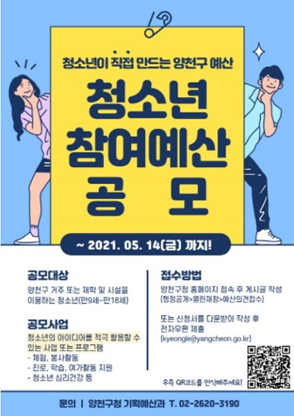 [열린의정뉴스 = 김진성 기자] 서울 양천구(구청장 김수영)는 청소년이 주체가 돼 원하는 사업을 제안하는 '2022년도 청소년 참여예산 제안사업'을 내달 14일까지 공모한다.