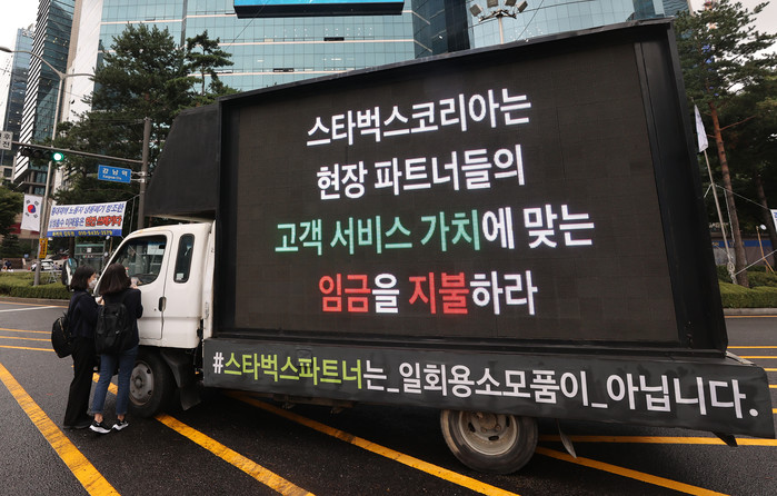 스타벅스 직원들은 이날 오전 10시부터 트럭 2대에 처우 개선을 촉구하는 전광판을 단 채 강남과 강북으로 나눠 시위를 진행했다.