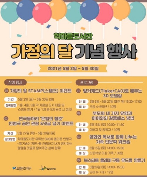 도서관은 ▶강연 <부모의 네 가지 유형과 아이와의 갈등 해소 방법> ▶강연 '영화와 독서로 함께 나누는 가족 인문학 워크숍' ▶체험 '팅커캐드(TinkerCAD)로 배우는 3D 모델링' ▶체험 '클레이 구름 무드등 만들기' ▶북큐레이션 도서 전시 종합자료실 '가족', 유아·어린이자료실 '감정', 러닝커먼스 '취미 노트' ▶가정의 달 STAMP(스탬프) 이벤트 ▶공연 <연극동아리 '은발의 청춘' 그림자 인형극 「벌거숭이 양반」을 진행한다.