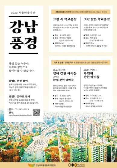 [열린의정뉴스 = 최성일 기자] 강남구(구청장 정순균)가 '2020 서울마을주간'을 맞아 24일부터 28일까지 강남구 마을인문학 온라인 강연인 '강남풍경'을 4회에 걸쳐 진행한다.