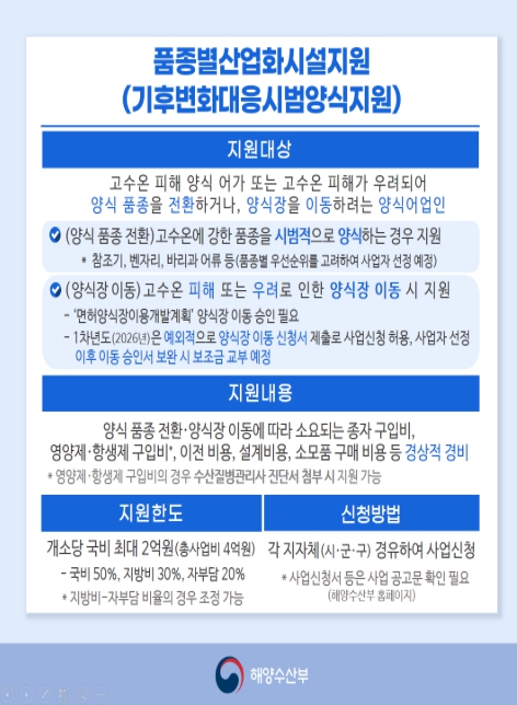 [코리아 이슈저널=최준석 기자] 해양수산부는 기후변화에 선제적으로 대응하고 어가의 소득 안정을 도모하기 위해 2월 23일부터 3월 31일까지 ‘2026년 기후변화 대응 시범 양식 지원사업’ 대상 어가를 공모한다고 밝혔다.