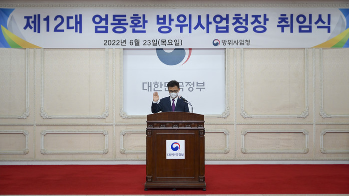 | ▲ 엄동환 방위사업청장이 지난달 23일 정부과천청사 방위사업청에서 열린 취임식에서 취임 선서하고 있다. 2022.6.23 [방위사업청 제공. 재판매 및 DB 금지] |