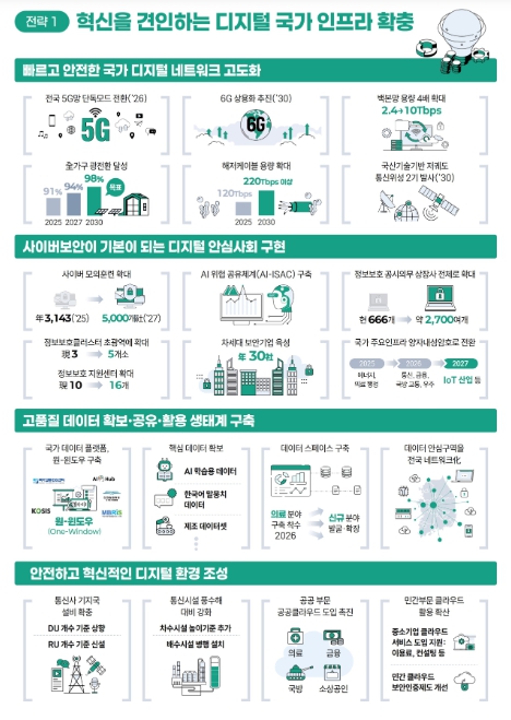 (①디지털 기반 시설'인프라' 확충) 전국 5세대 이동통신망을 단독 모드(SA)로 전환하는 등 5세대 이동통신을 고도화하고, 차세대 6세대 이동통신 상용화 기술을 개발하여 2030년 6세대 이동통신 상용화를 추진하는 등 국가 디지털 연결망(네트워크)을 고도화해 나갈 계획이다. 또한, 정보 보호 관리체계를 강화하고 공공‧민간 사이버보안 역량 강화를 위한 제도개선을 추진하는 등 사이버 위협으로부터 안전한 디지털 안심 사회를 구현하는 한편, 국가 데이터 통합 온라인 체제 기반(플랫폼)을 구축하는 등 고품질 데이터 생태계를 조성한다.