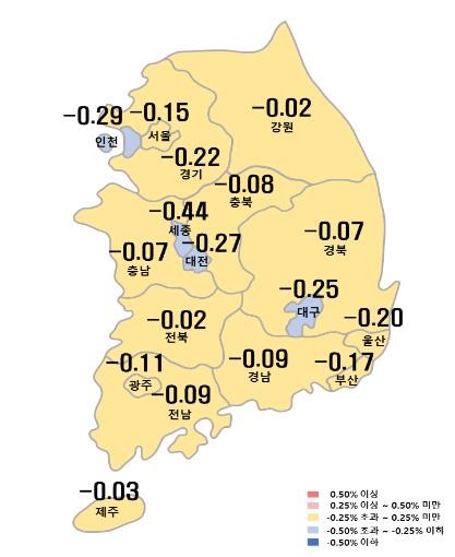 전국 17개 광역시·도 아파트값이 모두 하락한 가운데 이번주 전국 아파트값은 0.17% 떨어지며 지난주(-0.15%)보다 하락세가 가팔라졌다.