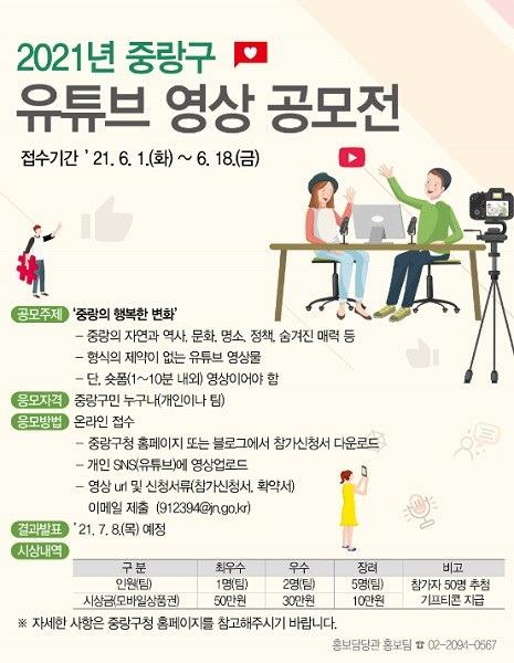 주요 공모 내용은 중랑구의 자연과 역사, 문화, 명소, 정책, 숨겨진 매력 등을 형식의 제약 없이 1~10분 내외의 동영상으로 제작하고 개인 SNS(유튜브)로 업로드 하면 된다.