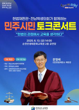이어지는 토크 콘서트에서는 전남학생의회가 진행을 맡아, 학생들과 문 재판관이 교육과 헌법, 민주주의를 주제로 자유롭게 의견을 나눈다.