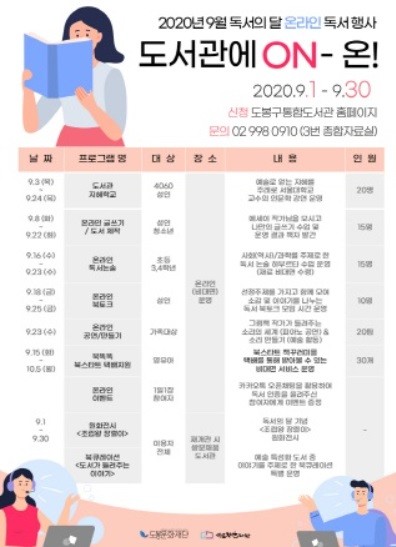 [열린의정뉴스 = 김진성 기자] 도봉구(구청장 이동진) 쌍문채움도서관은 오는 9월 독서의 달을 맞아 코로나19 확산 예방에 대응하는 온라인 독서의 달 행사 '도서관의 ON!'을 운영한다.