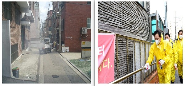 | ▲ 월동 모기 방제 작업을 하고 있는 모습(왼쪽)과 노량진역 일대 방역을 하고 있는 이창우 동작구청장[출처=동작구청] |