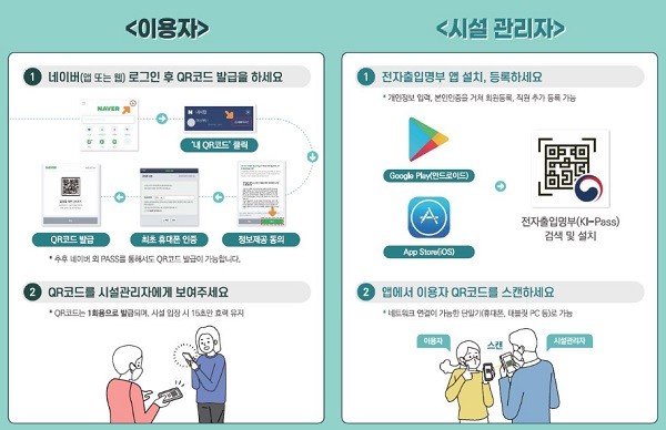 한편, QR코드 인식을 통해 수집된 개인별 정보는 네이버 등 QR코드 발급회사의 서버에 저장‧관리되고 시설방문 정보는 사회보장정보원 서버에 암호화되어 분산 보관되며 4주 후 자동 폐기된다.