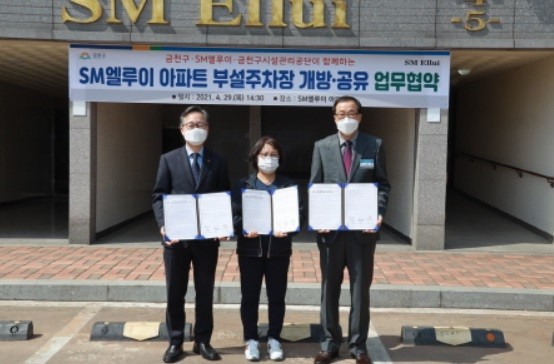 [열린의정뉴스 = 김진성 기자] 금천구(구청장 유성훈)가 4월 29일 오후 2시 30분 SM엘루이 아파트(시흥대로37길 20) 1층에서 'SM엘루이 아파트', '금천구 시설관리공단'과 부설주차장 개방·공유를 위한 3자간 업무협약을 체결했다.