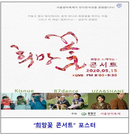 ‘희망꽃 콘서트‘는 오는 15일 오후 8시 중랑구청 공식 유튜브 채널에서 1시간 50분 동안 라이브로 방송되며 ▲인디밴드 Kisnue(키스누), 87dance(팔칠댄스)와 2019년 서울장미축제의 주제곡인 “rose”를 선보인 UZA&SHANE(우자앤쉐인)의 라이브 공연 ▲류경기 중랑구청장 응원 메시지 ▲코로나19 극복 응원 희망토크쇼 등 다양한 콘텐츠로 이루어질 예정이다.