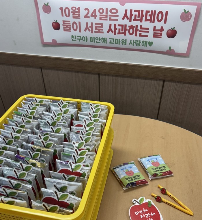 행사 기간 동안 상담실에서는 ‘사과데이 우체국’을 운영해 학생들이 직접 손편지를 작성해 친구, 선생님, 가족 등에게 미안함이나 고마움을 전할 수 있도록 했다.